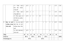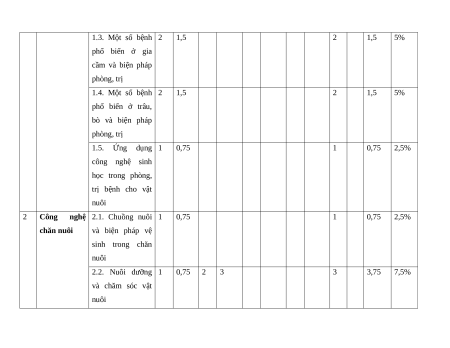 Công nghệ 2.1. Chuồng nuôi 1 0,75 1 0,75 2,5% chăn nuôi và biện pháp vệ sinh trong chăn nuôi 2.2. Nuôi dưỡng 1 0,75 2 3 3 3,75 7,5% và chăm sóc vật nuôi 2.3. Chăn nuôi 1 0,75 2 3 3 3,75 7,5% theo tiêu chuẩn VietGAP 2.4. Chăn nuôi 1 0,75 2 3 3 3,75 7,5% công nghệ cao 2.5. Bảo quản và 1 0,75 2 3 1 10 3 1 13,75 27,5% chế biến sản phẩm chăn nuôi 3
