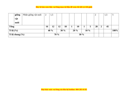giống Nhân giống vật nuôi 2 1,5 2 1,5 5 vật nuôi Tổng 16 12 12 18 1 10 1 5 28 2 45 Tỉ lệ (%) 40 % 30 % 20 % 10 % 100% Tỉ lệ chung (%) 70 % 30 %