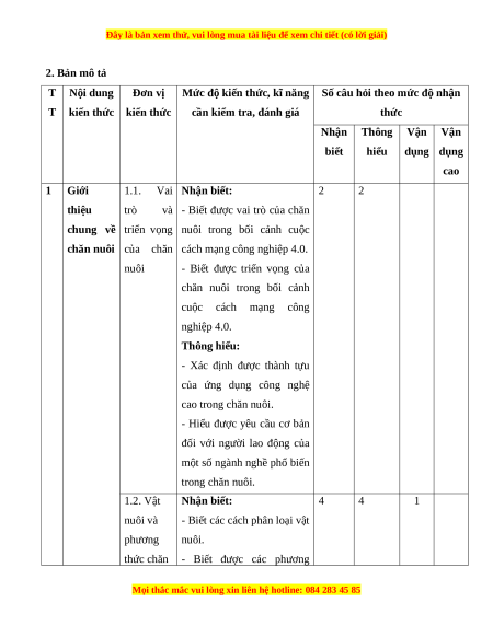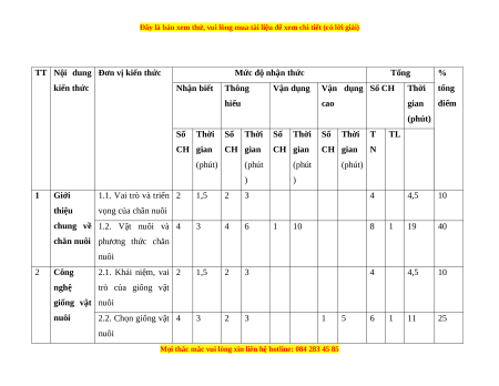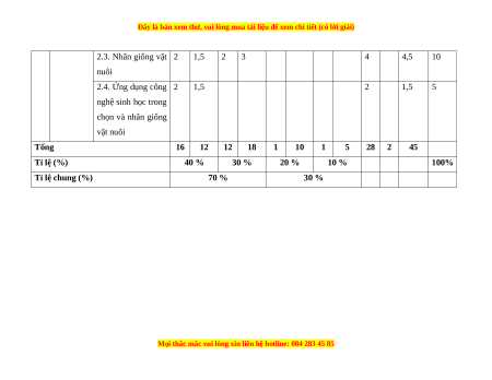 2.3. Nhân giống vật 2 1,5 2 3 4 4,5 10 nuôi 2.4. Ứng dụng công 2 1,5 2 1,5 5 nghệ sinh học trong chọn và nhân giống vật nuôi Tổng 16 12 12 18 1 10 1 5 28 2 45 Tỉ lệ (%) 40 % 30 % 20 % 10 % 100% Tỉ lệ chung (%) 70 % 30 %