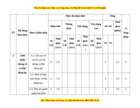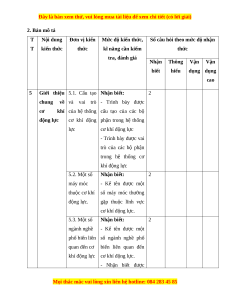 Đơn vị kiến thức tổng kiến thức Thời điểm Thời Thời Thời Số Số Số gian Số gian gian gian TN TL CH CH CH (phút CH (phút) (phút) (phút) ) 5 Giới 5.1. Cấu tạo và thiệu vai trò của hệ 2 1,5 2 1,5 5 chung về thống cơ khí cơ khí động lực động lực 5.2. Một số máy móc thuộc cơ khí 2 1,5 2 1,5 5 động lực. 5.3. Một số ngành 2 1,5 2 1,5 5 nghề phổ biến
