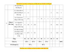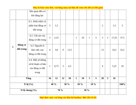 liên quan đến cơ khí động lực 6.1. Khái niệm và phân loại động cơ 2 1,5 2 1,5 5 đốt trong 6.2. Cấu tạo của 3 2,25 1 10 1 5 3 2 17,25 37,5 động cơ đốt trong Động cơ 6 6.3. Nguyên lí đốt trong làm việc của 4 3,0 9 13,5 13 16,5 32,5 động cơ đốt trong 6.4. Một số thông số kĩ thuật cơ bản 1 0,75 3 4,5 4 5,25 10 của động cơ đốt trong Tổng 16 12 12 18 1 10 1 5 28 2 45 Tỉ lệ (%) 40 % 30 % 20 % 10 % 100% Tỉ lệ chung (%) 70 % 30 %