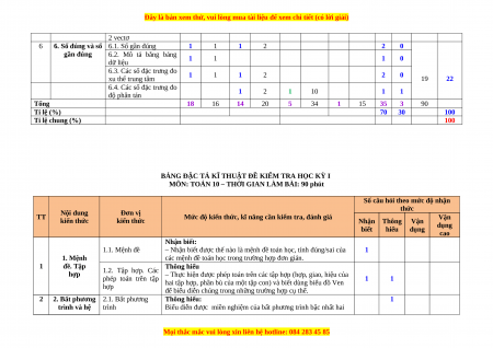 Đơn vị kiến thức Thời tổng thức Thời Thời Thời Thời gian Số Số Số Số điểm gian gian gian gian TN TL (phút) CH CH CH CH (phút) (phút) (phút) (phút) 1.1. Mệnh đề 1 1 1 0 1. Mệnh đề. 1 4 6 Tập hợp 1.2. Tập hợp. Các phép 1 1 1 2 2 0 toán trên tập hợp