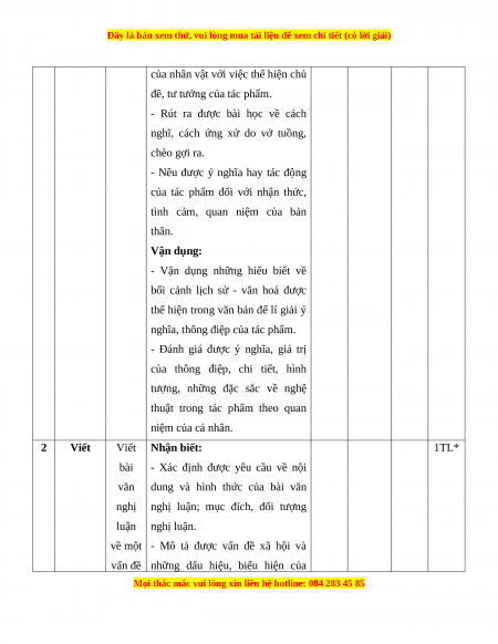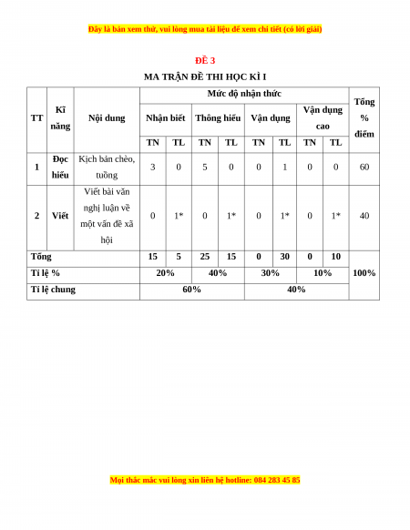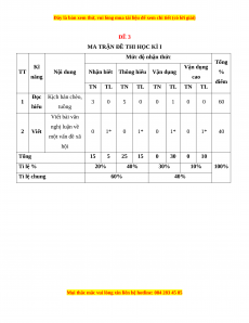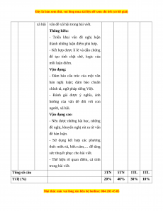 Nhận biết Thông hiểu Vận dụng % năng cao điểm TN TL TN TL TN TL TN TL Đọc Kịch bản chèo, 1 3 0 5 0 0 1 0 0 60 hiểu tuồng Viết bài văn nghị luận về 2 Viết 0 1* 0 1* 0 1* 0 1* 40 một vấn đề xã hội Tổng 15 5 25 15 0 30 0 10 Tỉ lệ % 20% 40% 30% 10% 100% Tỉ lệ chung 60% 40%