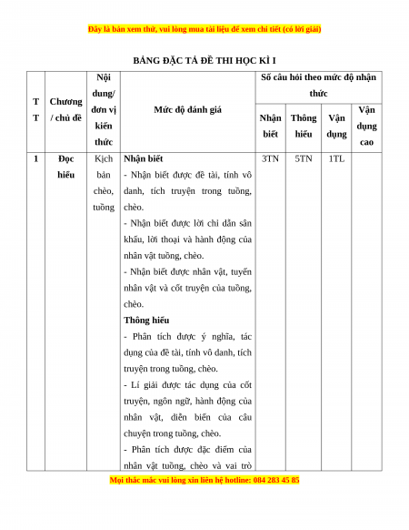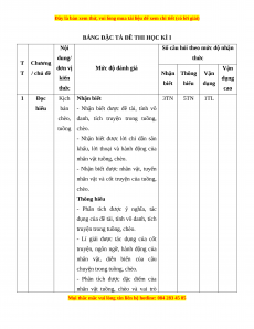 Số câu hỏi theo mức độ nhận dung/ thức T Chương đơn vị Mức độ đánh giá Vận T / chủ đề Nhận Thông Vận kiến dụng biết hiểu dụng thức cao 1 Đọc Kịch Nhận biết 3TN 5TN 1TL hiểu bản