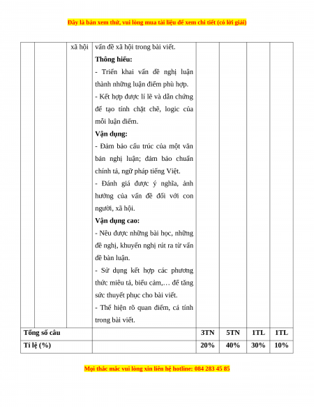 - Thể hiện rõ quan điểm, cá tính trong bài viết. Tổng số câu 3TN 5TN 1TL 1TL Tỉ lệ (%) 20% 40% 30% 10%
