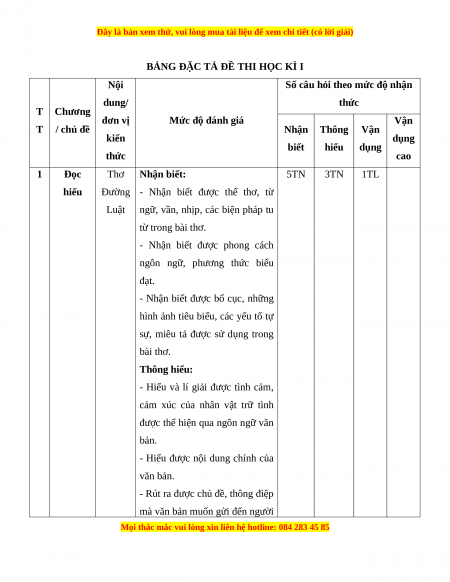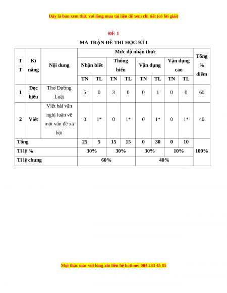 Mức độ nhận thức Tổng T Kĩ Thông Vận dụng Nội dung Nhận biết Vận dụng % T năng hiểu cao điểm TN TL TN TL TN TL TN TL Đọc Thơ Đường 1 5 0 3 0 0 1 0 0 60 hiểu Luật Viết bài văn nghị luận về 2 Viết 0 1* 0 1* 0 1* 0 1* 40 một vấn đề xã hội Tổng 25 5 15 15 0 30 0 10 Tỉ lệ % 30% 30% 30% 10% 100% Tỉ lệ chung 60% 40%