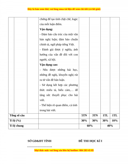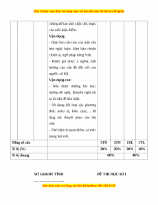 - Thể hiện rõ quan điểm, cá tính trong bài viết. Tổng số câu 5TN 3TN 1TL 1TL Tỉ lệ (%) 30% 30% 30% 10% Tỉ lệ chung 60% 40% SỞ GD&ĐT TỈNH ĐỀ THI HỌC KÌ I