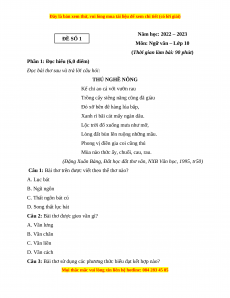 Câu 1: Bài thơ trên được viết theo thể thơ nào? A. Lục bát B. Ngũ ngôn C. Thất ngôn bát cú D. Song thất lục bát