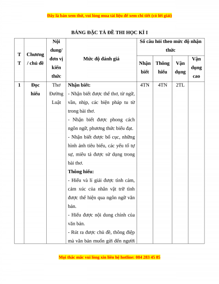 Số câu hỏi theo mức độ nhận dung/ thức T Chương đơn vị Mức độ đánh giá Vận T / chủ đề Nhận Thông Vận kiến dụng biết hiểu dụng thức cao 1 Đọc Thơ Nhận biết: 4TN 4TN 2TL hiểu