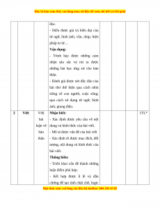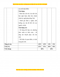 Mức độ nhận thức Tổng T Kĩ Thông Vận dụng Nội dung Nhận biết Vận dụng % T năng hiểu cao điểm TN TL TN TL TN TL TN TL Đọc Thơ Đường 1 4 0 4 0 0 2 0 0 60 hiểu Luật Viết bài luận 2 Viết 0 1* 0 1* 0 1* 0 1* 40 về bản thân Tổng 20 5 20 15 0 30 0 10 Tỉ lệ % 25% 35% 30% 10% 100% Tỉ lệ chung 60% 40%
