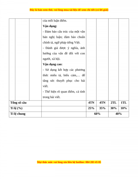 - Thể hiện rõ quan điểm, cá tính trong bài viết. Tổng số câu 4TN 4TN 2TL 1TL Tỉ lệ (%) 25% 35% 30% 10% Tỉ lệ chung 60% 40%
