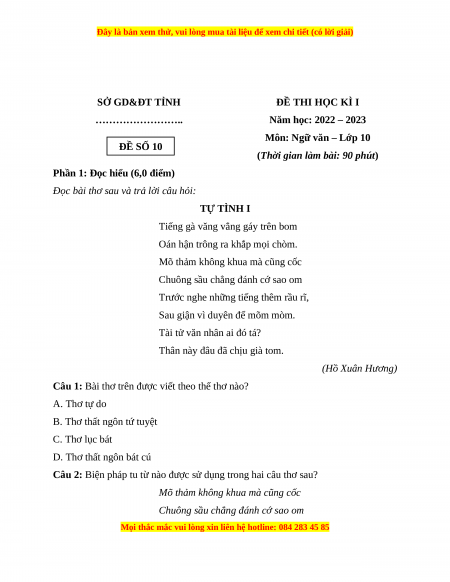 Môn: Ngữ văn – Lớp 10 ĐỀ SỐ 10