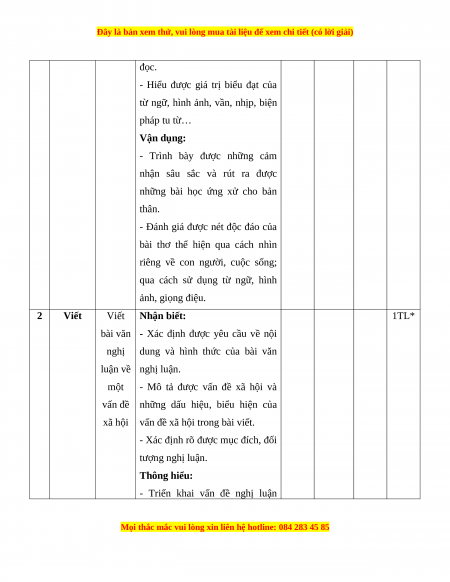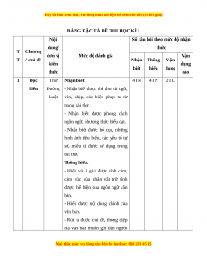 Mức độ nhận thức Tổng T Kĩ Thông Vận dụng Nội dung Nhận biết Vận dụng % T năng hiểu cao điểm TN TL TN TL TN TL TN TL Đọc Thơ Đường 1 4 0 4 0 0 2 0 0 60 hiểu Luật Viết bài văn nghị luận về 2 Viết 0 1* 0 1* 0 1* 0 1* 40 một vấn đề xã hội Tổng 20 5 20 15 0 30 0 10 Tỉ lệ % 25% 35% 30% 10% 100% Tỉ lệ chung 60% 40%