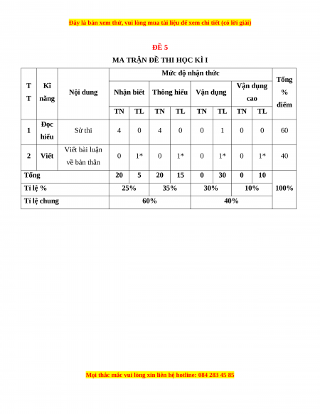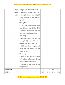 Nhận biết Thông hiểu Vận dụng % T năng cao điểm TN TL TN TL TN TL TN TL Đọc 1 Sử thi 4 0 4 0 0 1 0 0 60 hiểu Viết bài luận 2 Viết 0 1* 0 1* 0 1* 0 1* 40 về bản thân Tổng 20 5 20 15 0 30 0 10 Tỉ lệ % 25% 35% 30% 10% 100% Tỉ lệ chung 60% 40%