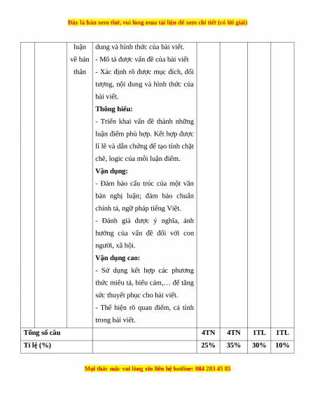 - Thể hiện rõ quan điểm, cá tính trong bài viết. Tổng số câu 4TN 4TN 1TL 1TL Tỉ lệ (%) 25% 35% 30% 10%