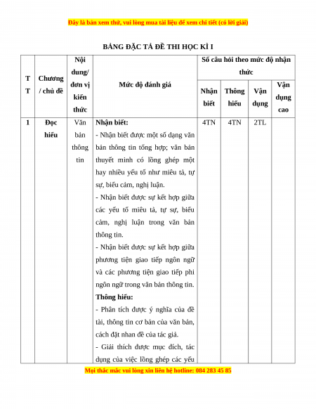Số câu hỏi theo mức độ nhận dung/ thức T Chương đơn vị Mức độ đánh giá Vận T / chủ đề Nhận Thông Vận kiến dụng biết hiểu dụng thức cao 1 Đọc Văn Nhận biết: 4TN 4TN 2TL hiểu bản