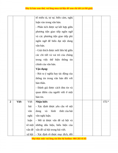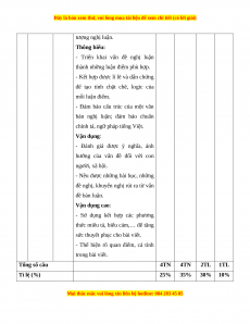 Nhận biết Thông hiểu Vận dụng % năng cao điểm TN TL TN TL TN TL TN TL Đọc Văn bản thông 1 4 0 4 0 0 2 0 0 60 hiểu tin Viết bài văn nghị luận về 2 Viết 0 1* 0 1* 0 1* 0 1* 40 một vấn đề xã hội Tổng 20 5 20 15 0 30 0 10 Tỉ lệ % 25% 35% 30% 10% 100% Tỉ lệ chung 60% 40%