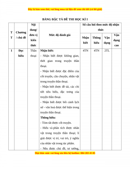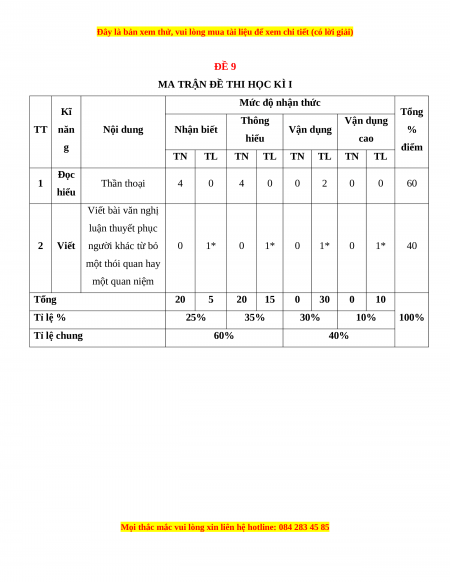 Mức độ nhận thức Kĩ Tổng Thông Vận dụng TT năn Nội dung Nhận biết Vận dụng % hiểu cao g điểm TN TL TN TL TN TL TN TL Đọc 1 Thần thoại 4 0 4 0 0 2 0 0 60 hiểu Viết bài văn nghị luận thuyết phục 2 Viết người khác từ bỏ 0 1* 0 1* 0 1* 0 1* 40 một thói quan hay một quan niệm Tổng 20 5 20 15 0 30 0 10 Tỉ lệ % 25% 35% 30% 10% 100% Tỉ lệ chung 60% 40%
