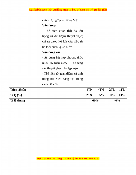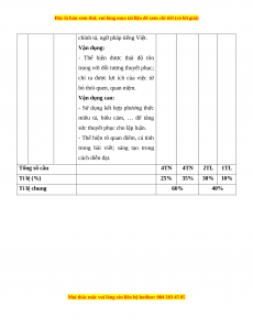 trong bài viết; sáng tạo trong cách diễn đạt. Tổng số câu 4TN 4TN 2TL 1TL Tỉ lệ (%) 25% 35% 30% 10% Tỉ lệ chung 60% 40%