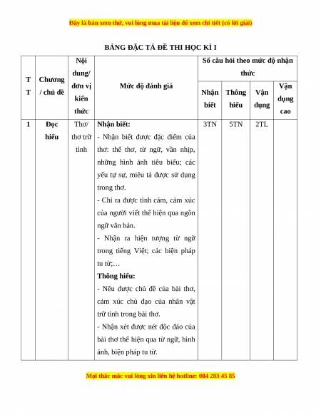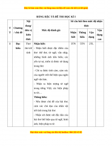 Số câu hỏi theo mức độ nhận dung/ thức T Chương đơn vị Mức độ đánh giá Vận T / chủ đề Nhận Thông Vận kiến dụng biết hiểu dụng thức cao 1 Đọc Thơ/ Nhận biết: 3TN 5TN 2TL hiểu