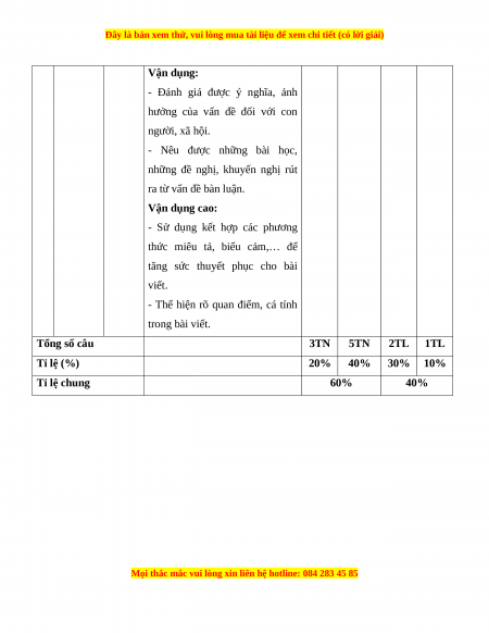 - Thể hiện rõ quan điểm, cá tính trong bài viết. Tổng số câu 3TN 5TN 2TL 1TL Tỉ lệ (%) 20% 40% 30% 10% Tỉ lệ chung 60% 40%