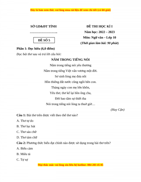 Môn: Ngữ văn – Lớp 10 ĐỀ SỐ 5