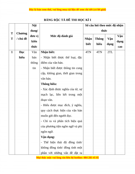 Số câu hỏi theo mức độ nhận dung/ thức T Chương đơn vị Mức độ đánh giá Vận T / chủ đề Nhận Thông Vận kiến dụng biết hiểu dụng thức cao 1 Đọc Văn Nhận biết: 4TN 4TN 2TL hiểu bản
