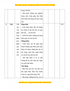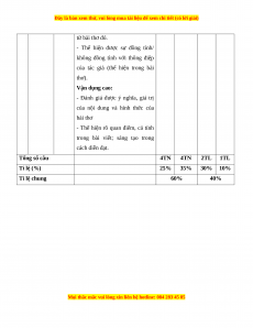 Nhận biết Thông hiểu Vận dụng % năng cao điểm TN TL TN TL TN TL TN TL Đọc Văn bản thông 1 4 0 4 0 0 2 0 0 60 hiểu tin Viết bài văn nghị luận phân 2 Viết 0 1* 0 1* 0 1* 0 1* 40 tích, đánh giá một bài thơ Tổng 20 5 20 15 0 30 0 10 Tỉ lệ % 25% 35% 30% 10% 100% Tỉ lệ chung 60% 40%