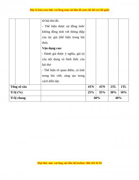 trong bài viết; sáng tạo trong cách diễn đạt. Tổng số câu 4TN 4TN 2TL 1TL Tỉ lệ (%) 25% 35% 30% 10% Tỉ lệ chung 60% 40%