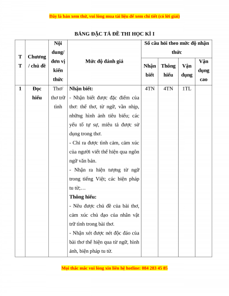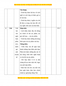 Mức độ nhận thức Tổng T Kĩ Thông Vận dụng Nội dung Nhận biết Vận dụng % T năng hiểu cao điểm TN TL TN TL TN TL TN TL Đọc Thơ/ thơ trữ 1 4 0 4 0 0 1 0 0 60 hiểu tình Viết bài văn nghị luận phân 2 Viết 0 1* 0 1* 0 1* 0 1* 40 tích, đánh giá một truyện kể Tổng 20 5 20 15 0 30 0 10 Tỉ lệ % 25% 35% 30% 10% 100% Tỉ lệ chung 60% 40%