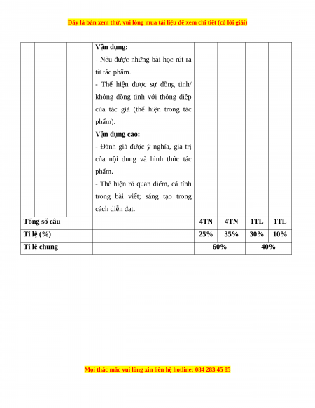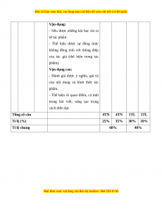 trong bài viết; sáng tạo trong cách diễn đạt. Tổng số câu 4TN 4TN 1TL 1TL Tỉ lệ (%) 25% 35% 30% 10% Tỉ lệ chung 60% 40%