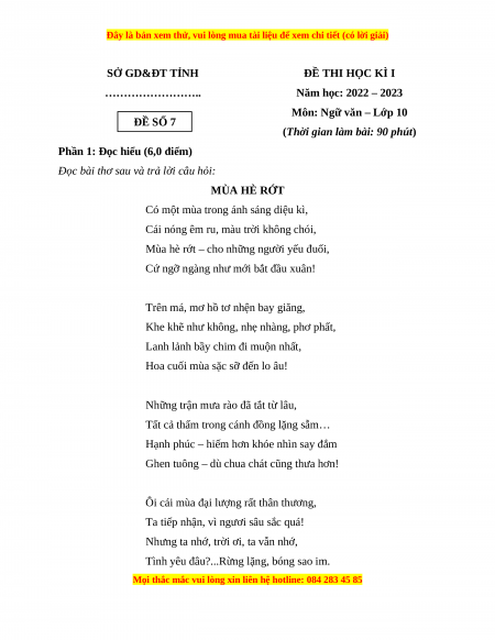 Môn: Ngữ văn – Lớp 10 ĐỀ SỐ 7