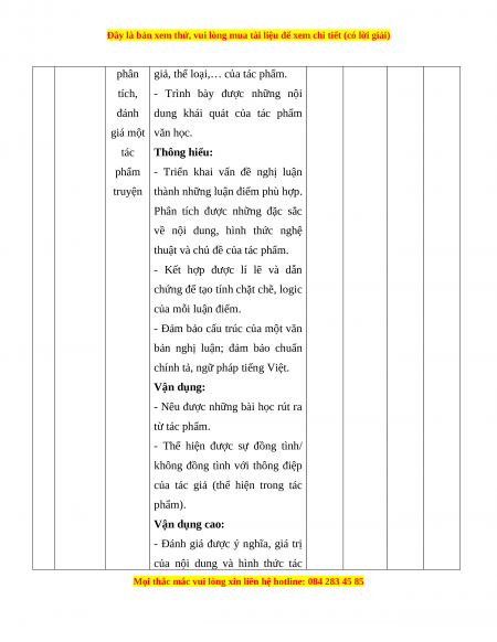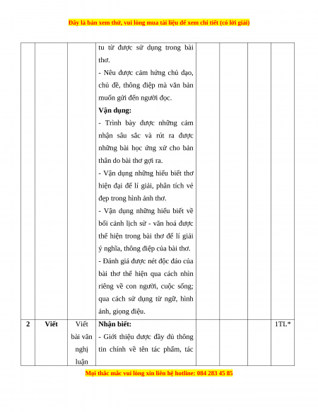 Mức độ nhận thức Tổng T Kĩ Thông Vận dụng Nội dung Nhận biết Vận dụng % T năng hiểu cao điểm TN TL TN TL TN TL TN TL Đọc Thơ/ thơ trữ 1 3 0 5 0 0 2 0 0 60 hiểu tình Viết bài văn nghị luận phân 2 Viết tích, đánh giá 0 1* 0 1* 0 1* 0 1* 40 một tác phẩm truyện Tổng 15 5 25 15 0 30 0 10 Tỉ lệ % 20% 40% 30% 10% 100% Tỉ lệ chung 60% 40%