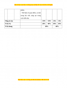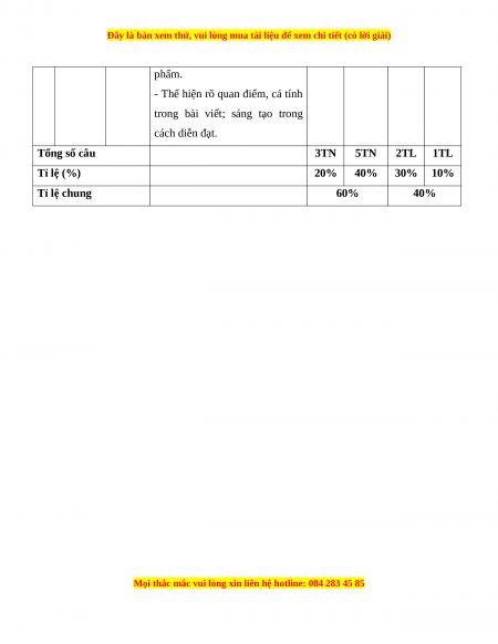 trong bài viết; sáng tạo trong cách diễn đạt. Tổng số câu 3TN 5TN 2TL 1TL Tỉ lệ (%) 20% 40% 30% 10% Tỉ lệ chung 60% 40%