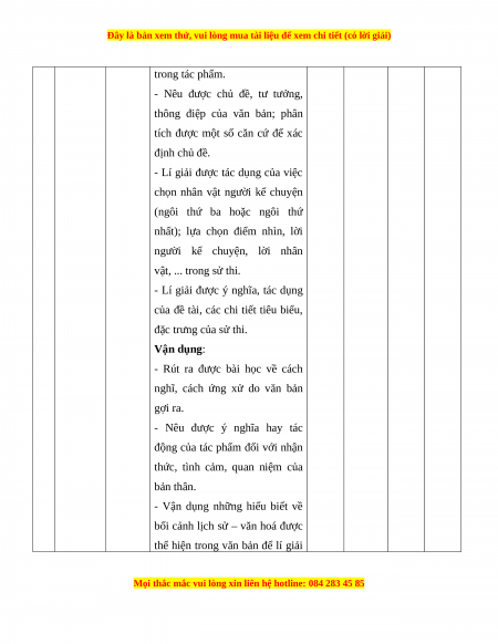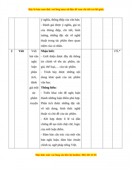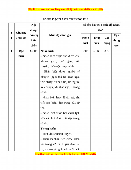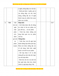 Mức độ nhận thức Tổng T Kĩ Thông Vận dụng Nội dung Nhận biết Vận dụng % T năng hiểu cao điểm TN TL TN TL TN TL TN TL Đọc 1 Sử thi 3 0 5 0 0 2 0 0 60 hiểu Viết bài văn nghị luận phân 2 Viết tích, đánh giá 0 1* 0 1* 0 1* 0 1* 40 một tác phẩm truyện Tổng 15 5 25 15 0 30 0 10 Tỉ lệ % 20% 40% 30% 10% 100% Tỉ lệ chung 60% 40%