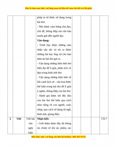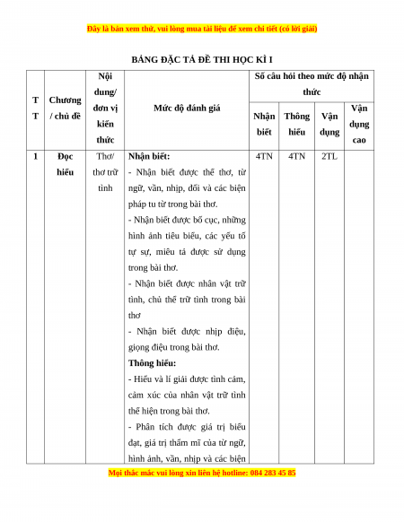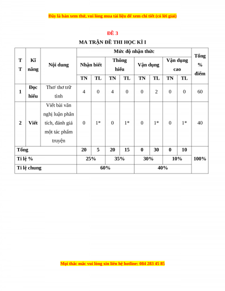 Mức độ nhận thức Tổng T Kĩ Thông Vận dụng Nội dung Nhận biết Vận dụng % T năng hiểu cao điểm TN TL TN TL TN TL TN TL Đọc Thơ/ thơ trữ 1 4 0 4 0 0 2 0 0 60 hiểu tình Viết bài văn nghị luận phân 2 Viết tích, đánh giá 0 1* 0 1* 0 1* 0 1* 40 một tác phẩm truyện Tổng 20 5 20 15 0 30 0 10 Tỉ lệ % 25% 35% 30% 10% 100% Tỉ lệ chung 60% 40%