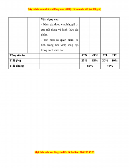 tính trong bài viết; sáng tạo trong cách diễn đạt. Tổng số câu 4TN 4TN 2TL 1TL Tỉ lệ (%) 25% 35% 30% 10% Tỉ lệ chung 60% 40%