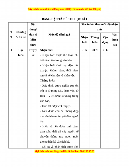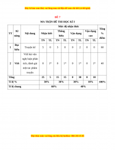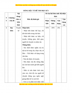 Mức độ nhận thức Tổng Kĩ Thông Vận dụng TT Nội dung Nhận biết Vận dụng % năng hiểu cao điểm TN TL TN TL TN TL TN TL Đọc 1 Truyện kể 5 0 3 0 0 2 0 0 60 hiểu Viết bài văn nghị luận phân 2 Viết tích, đánh giá 0 1* 0 1* 0 1* 0 1* 40 một tác phẩm truyện Tổng 25 5 15 15 0 30 0 10 Tỉ lệ % 30% 30% 30% 10% 100% Tỉ lệ chung 60% 40%