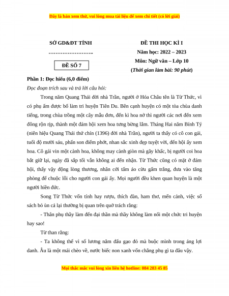 Môn: Ngữ văn – Lớp 10 ĐỀ SỐ 7