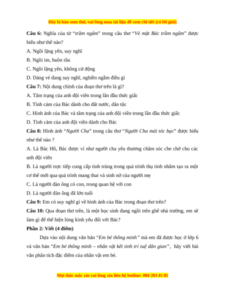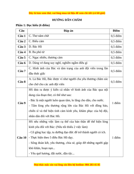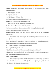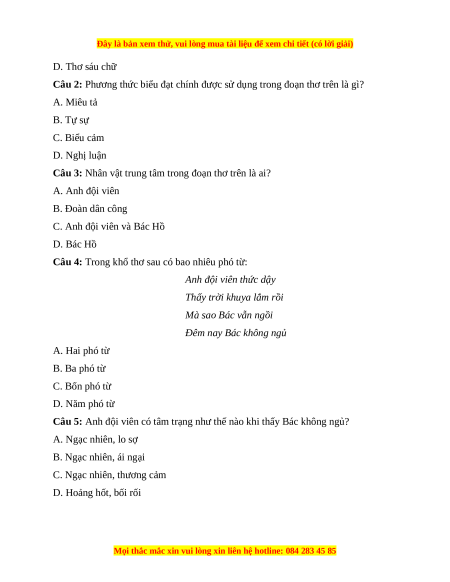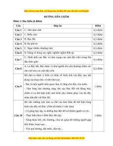 Câu 1 C. Thơ năm chữ 0,5 điểm Câu 2 C. Biểu cảm 0,5 điểm Câu 3 D. Bác Hồ 0,5 điểm Câu 4 B. Ba phó từ 0,5 điểm