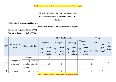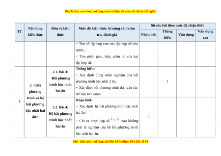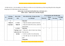 Đơn vị kiến thức tổng thức Thời Thời Thời Thời gian Số Số Số Số điểm gian gian gian gian TN TL (phút) CH CH CH CH (phút) (phút) (phút) (phút) 1.1. Mệnh đề 1 1,5 1 1. 1.2. Tập hợp và 1 5 6 và tập hợp> các phép toán trên 1 1,5 1 2 2 tập hợp 2 2. 2.1. Bất phương 1 2 1 4 4