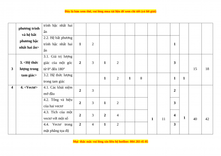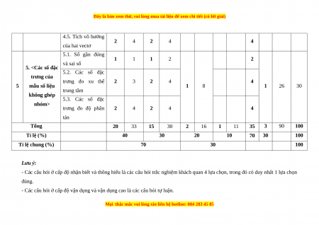 4.5. Tích vô hướng 2 4 2 4 4 của hai vectơ 5.1. Số gần đúng 1 1 1 2 2 và sai số 5. 5.2. Các số đặc trưng của trưng đo xu thế 2 3 2 4 4 5 mẫu số liệu 1 8 1 26 30 trung tâm không ghép 5.3. Các số đặc nhóm> trưng đo độ phân 2 4 2 4 4 tán Tổng 20 33 15 30 2 16 1 11 35 3 90 100 Tỉ lệ (%) 40 30 20 10 70 30 100 Tỉ lệ chung (%) 70 30 100 Lưu ý: