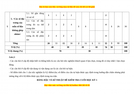 5.1. Số gần đúng 1 1 1 2 2 và sai số 5. 5.2. Các số đặc trưng của trưng đo xu thế 2 3 2 4 4 5 mẫu số liệu 1 8 1 26 30 trung tâm không ghép 5.3. Các số đặc nhóm> trưng đo độ phân 2 4 2 4 4 tán Tổng 20 33 15 30 2 16 1 11 35 3 90 100 Tỉ lệ (%) 40 30 20 10 70 30 100 Tỉ lệ chung (%) 70 30 100 Lưu ý: