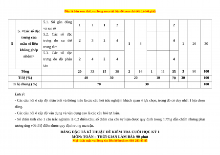 5.1. Số gần đúng 1 1 1 2 2 và sai số 5. 5.2. Các số đặc trưng của trưng đo xu thế 2 3 2 4 4 5 mẫu số liệu 1 8 1 26 30 trung tâm không ghép 5.3. Các số đặc nhóm> trưng đo độ phân 2 4 2 4 4 tán Tổng 20 33 15 30 2 16 1 11 35 3 90 100 Tỉ lệ (%) 40 30 20 10 70 30 100 Tỉ lệ chung (%) 70 30 100 Lưu ý: