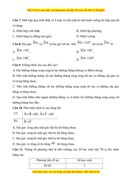 C. Hình lăng trụ đứng tam giác; D. Hình vuông. Câu 8. Hai góc và là hai góc kề bù. Nếu thì số đo là A. ; B. ; C. ; D. .