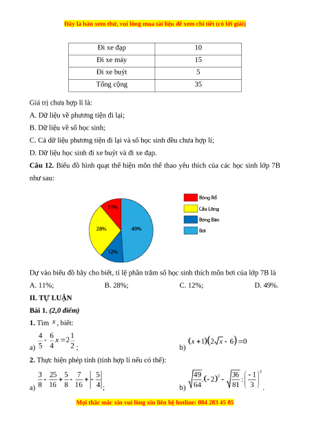 Câu 11. Thống kê phương tiện đi đến trường của 30 học sinh lớp 7B ta thu được bảng sau: Phương tiện đi lại Số học sinh Đi bộ 5