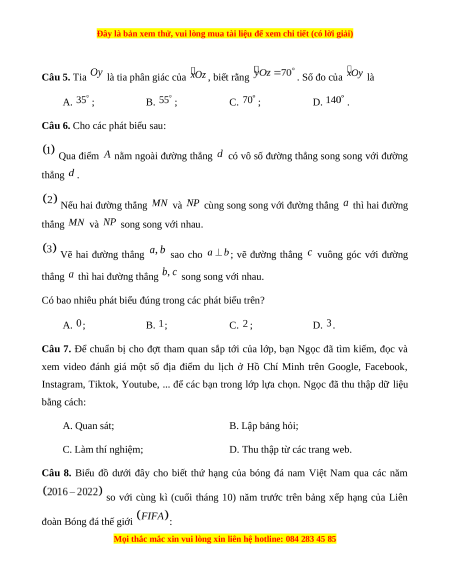 Câu 5. Tia là tia phân giác của , biết rằng . Số đo của là A. ; B. ; C. ; D. .