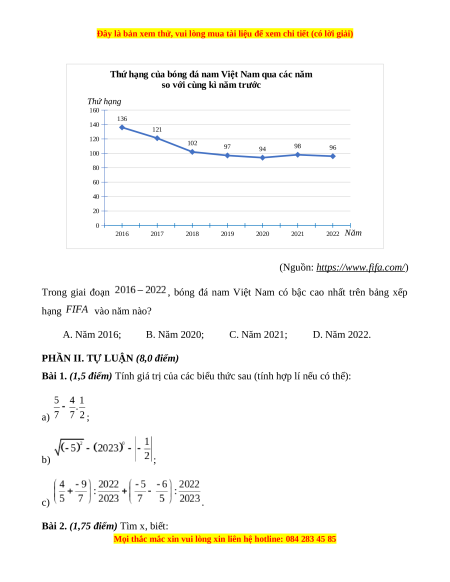 Câu 8. Biểu đồ dưới đây cho biết thứ hạng của bóng đá nam Việt Nam qua các năm
