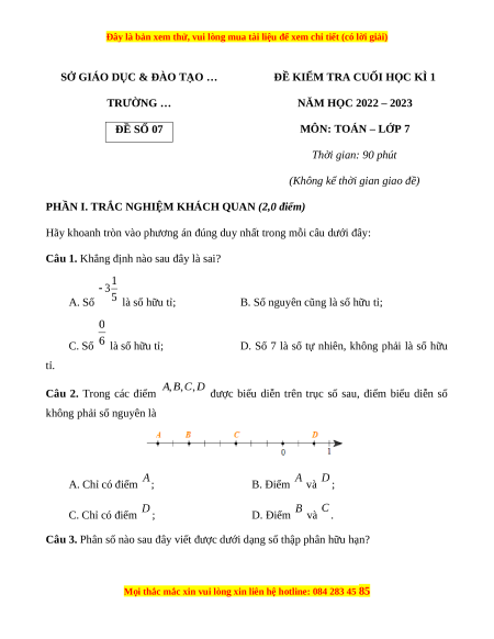 NĂM HỌC 2022 – 2023 ĐỀ SỐ 07 MÔN: TOÁN – LỚP 7 Thời gian: 90 phút