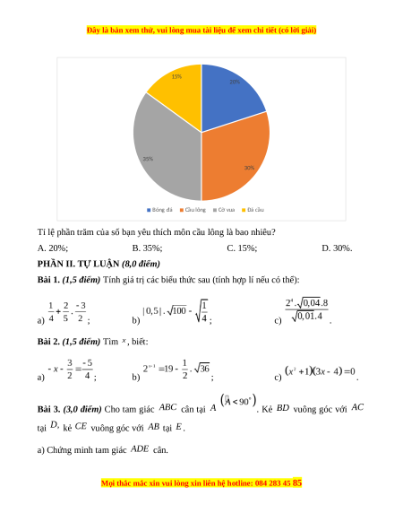 Câu 8. Biểu đồ dưới đây cho biết tỉ lệ phần trăm môn thể thao yêu thích các bạn lớp 7A:
